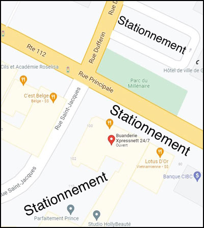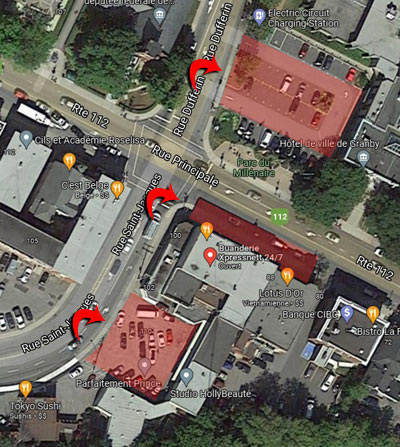 Vous pouvez vous stationner à trois endroits faciles et à quelques pas de notre porte. Soit derrière le bâtiment, passer par la rue sur le côté, soit devant dans la rue ou encore dans le stationnement de l’hôtel de ville juste de l’autre côté de la rue. Ce sont tous des stationnements gratuits et tout près. Pour vous orienter, référez-vous aux photos.